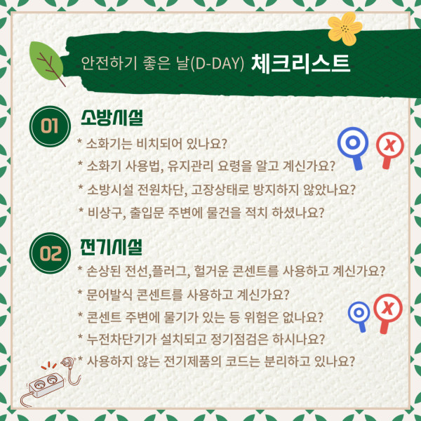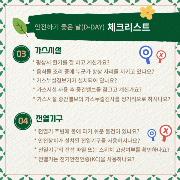안전하기 좋은날(D-day) 추진중입니다. 페이지 정보 작성자 119 작성일22-01-10 15:34 조회1,654회 댓글0건 관련링크 다음글 목록 본문 매월 둘째주 수요일은 안전하기 좋은날입니다.!! 점포별 자율안전점검표 활용하여 우리점포가 화재취약한 부분이 없는지 체크바랍니다. 겨울철 안전하게 보내세요 댓글목록 등록된 댓글이 없습니다. 다음글 목록
