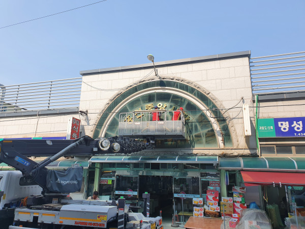 오늘 시장출입구 위에 있는 간판을 세척할 예정입니다.
