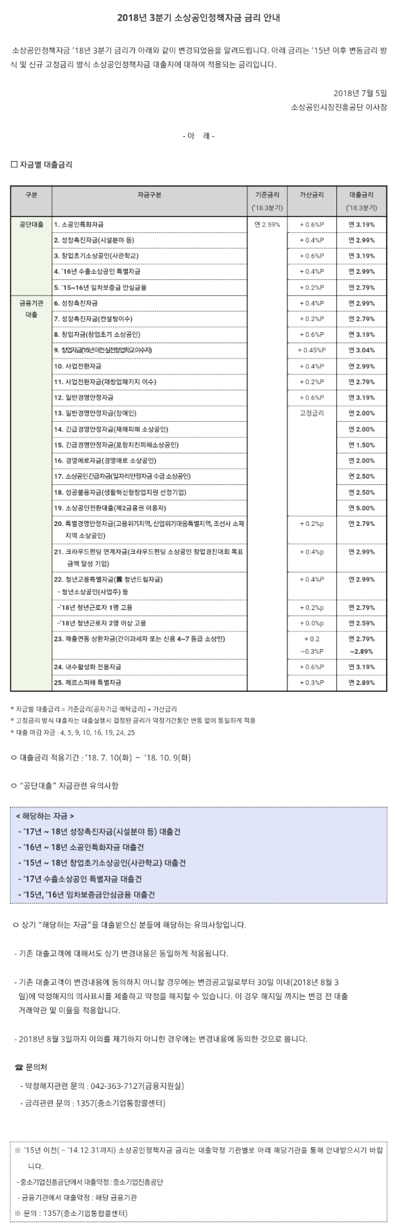 2018 3분기 소상공인정책자금 금리 안내 페이지 정보 작성자 최고관리자 작성일18-07-28 07:08 조회11,944회 댓글0건 관련링크 http://www.sbiz.or.kr/sup/custcenter/notice/1210305_1210.jsp 3844회 연결 이전글 다음글 목록 본문 2018 3분기 소상공인정책자금 금리 안내 댓글목록 등록된 댓글이 없습니다. 이전글 다음글 목록